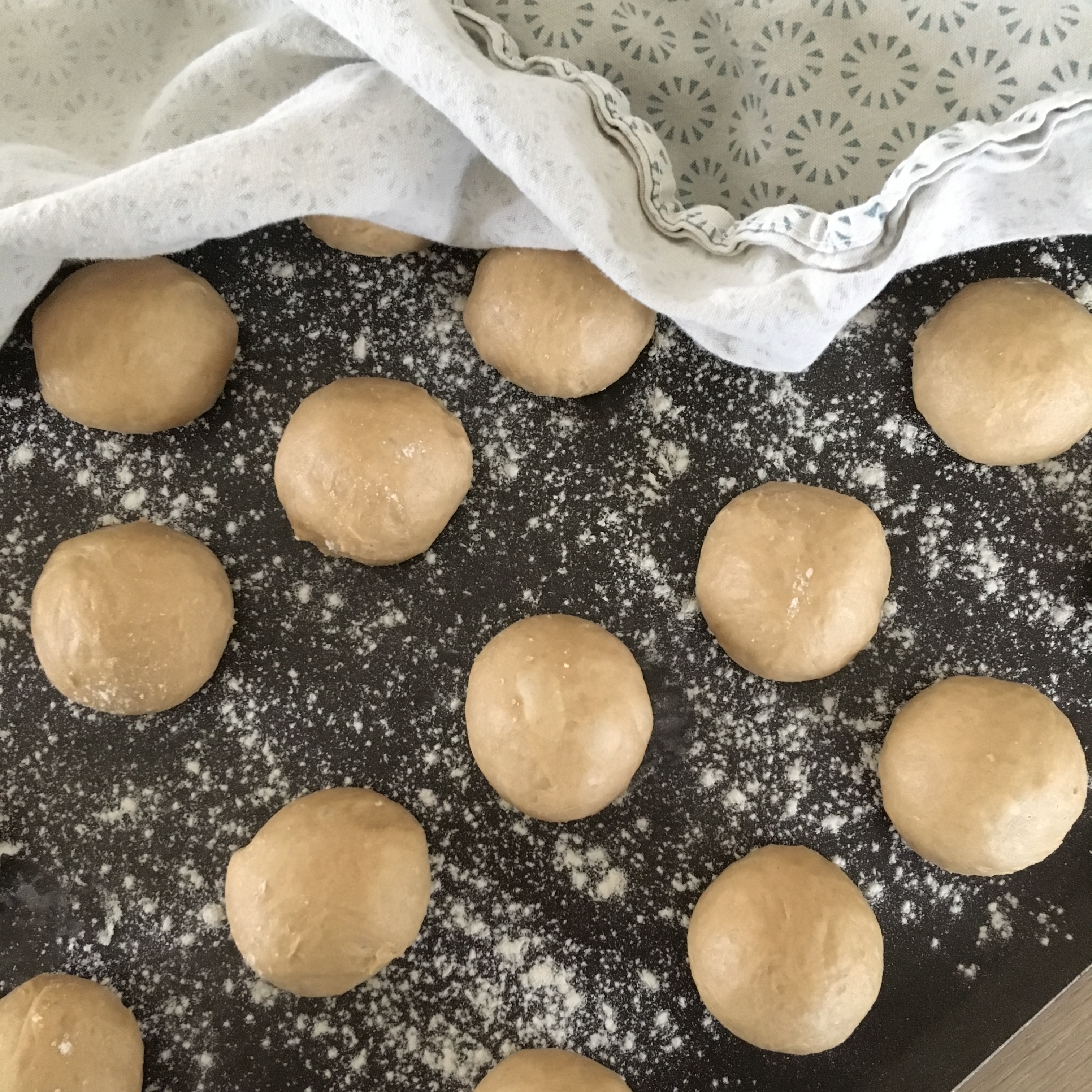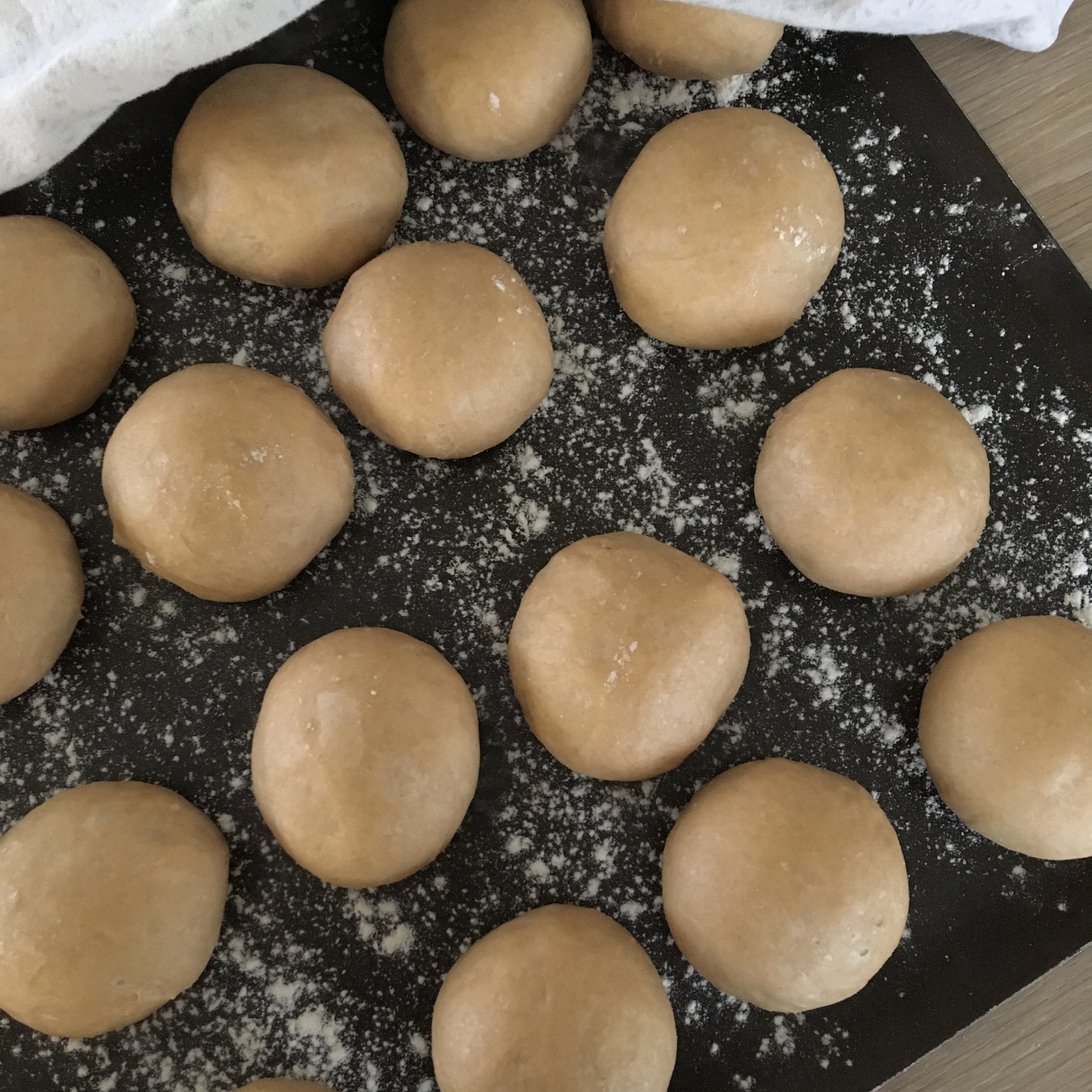 - Afvej 20 klumper à 30 g og tril dem til kugler. Sæt dem på et fad eller en bageplade, der er let drysset med mel. Fordel de små boller, så der er plads til at de kan hæve til næsten dobbelt størrelse. Læg et klæde over dem og stil dem lunt (- ikke varmt).