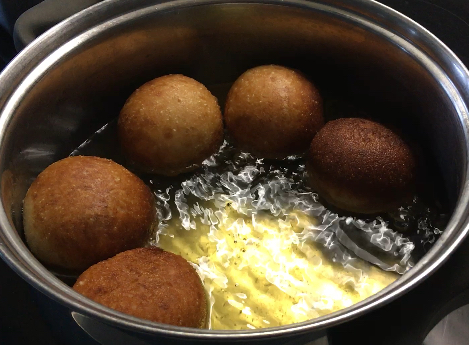 - Læg en lille bolle ad gangen på en hulske, og lad den forsigtigt glide ned i olien. Der er plads til at koge 5 beignets ad gangen. Når hver “dejkugle” har fået en fin mørkegylden farve på undersiden, skubber du dem rundt, så den lyse side kommer ned i den varme olie. De skal “steges” ca. 30-45 sekunder på hver halvdel, hvis olien ikke er for varm.