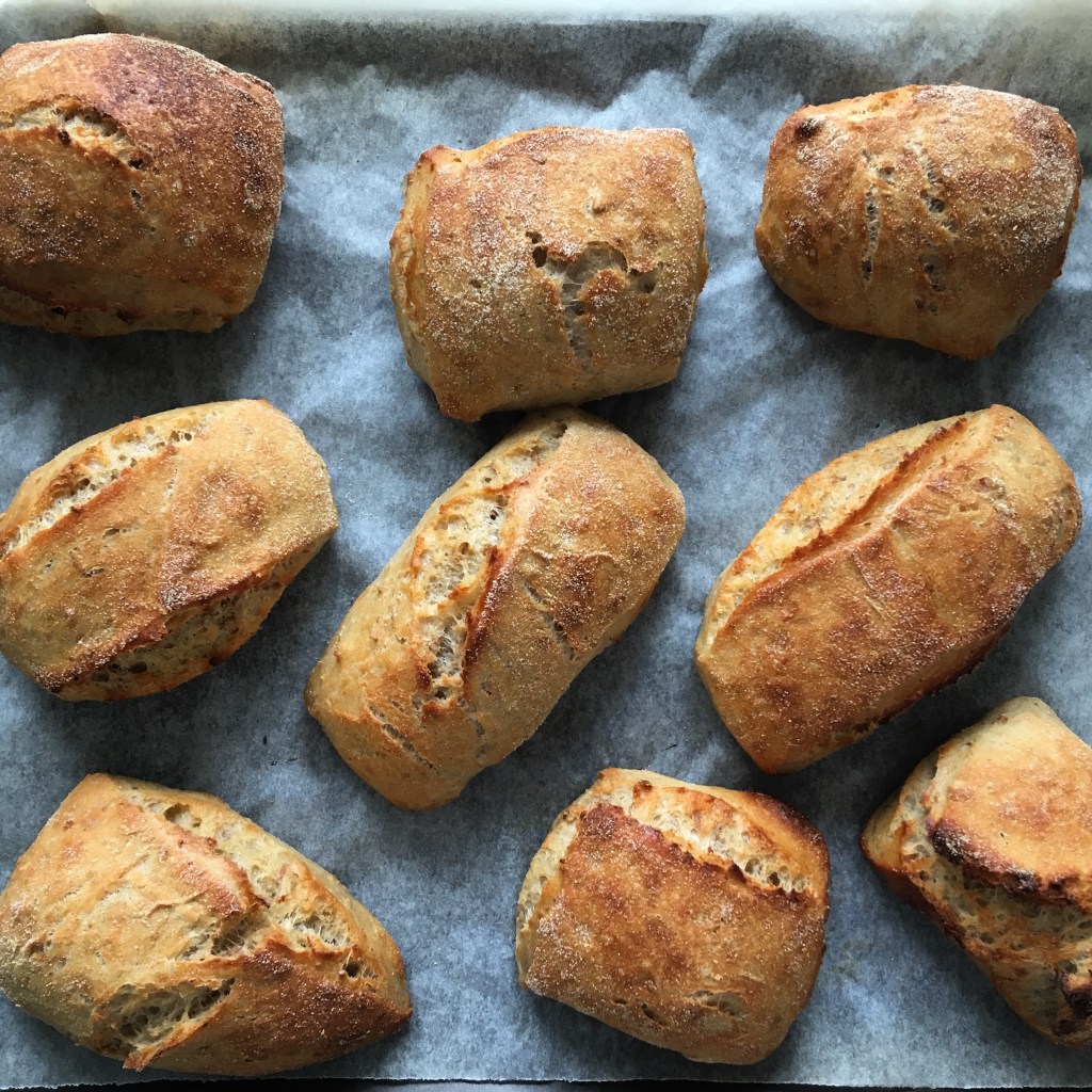 Langtidshævet dej er så godt, på så mange måder. Det tager 10-15 min at gøre dejen klar til hævning. Herefter hæver den mens du sover, udvikler smag, bliver sundere. Når du vågner, forvarmer du ovnen til 240 grader, og stykkerne skal blot stikkes ud og sættes på plader – ikke efterhæve. Så skal de bages ca. 20 min, afkøles let og voila – ja, what’s not to like?
