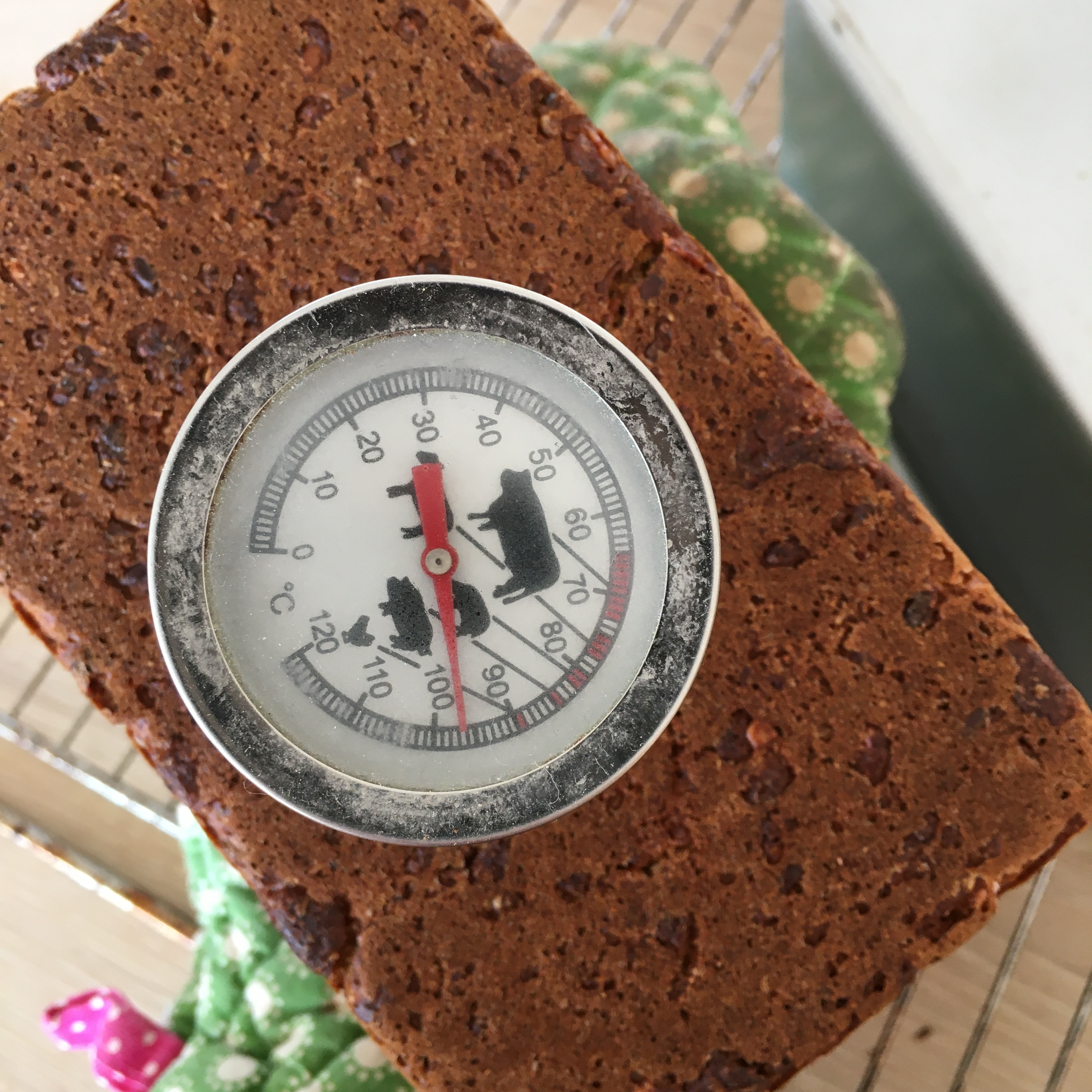 Når brødet er færdigbagt er kernetemperaturen 96 grader. Jeg tjekker altid temperaturen med et stegetermometer. Det er brandærgerligt at tage et rugbrød for tidligt ud af ovnen!