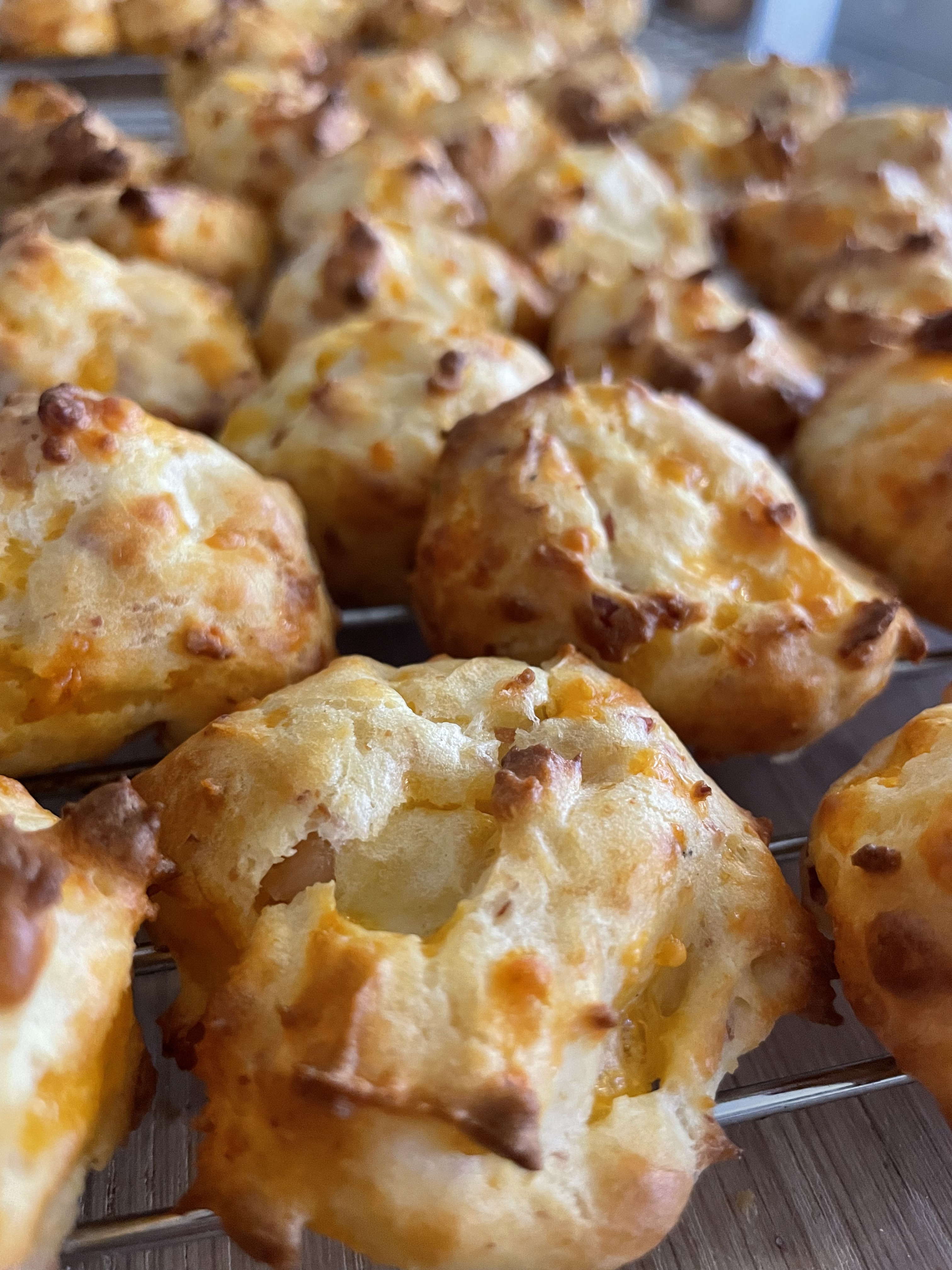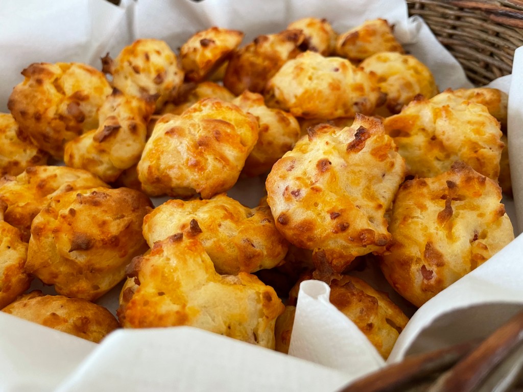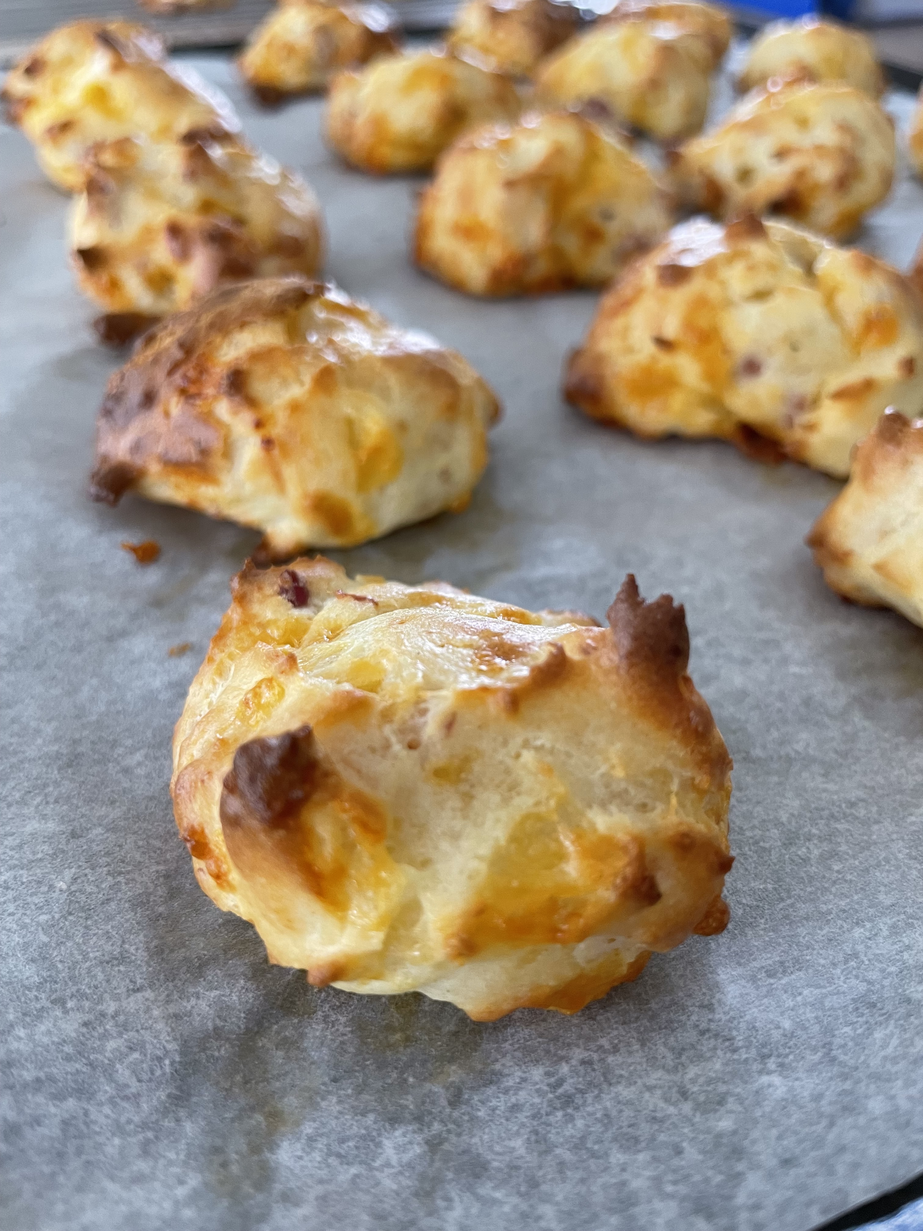 “Ejjjj – er der ikke flere….?” Det er nok den oftest hørte kommentar, når jeg serverer bakkelserne her. Mine oste-baconbakkelser er et smukt møde mellem sødmælk, smør, mel, æg, ost og bacon. De er bestemt ikke slankemad, men de er til gengæld verdens bedste appetizer eller tapas-snack. Jeg har hentet inspiration til opskriften her fra jysk vin og fra min moster Inger, som har bagt bakkelser, så længe jeg kan huske. Hendes opskrift er gengivet i min mors bagebog “Hjemmebagt”, og det er også moster Inger, jeg kan takke for de gode tips, der betyder, at bakkelserne aldrig slår fejl.